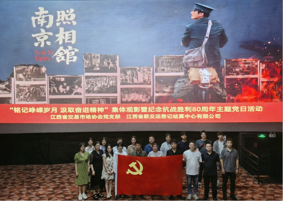 為紀(jì)念中國(guó)人民抗日戰(zhàn)爭(zhēng)暨世界反法西斯戰(zhàn)爭(zhēng)勝利80周年,緬懷革命先烈,弘揚(yáng)偉大抗戰(zhàn)精神和愛(ài)國(guó)主義精神,激勵(lì)全體黨員傳承紅色基因、賡續(xù)奮斗力量。7月25日下午,公司聯(lián)合江西省交易市場(chǎng)協(xié)會(huì)黨支部集體觀看電影《南京照相館》,開(kāi)展“銘記崢嶸歲月 汲取奮進(jìn)精神”紅色觀影活動(dòng)。