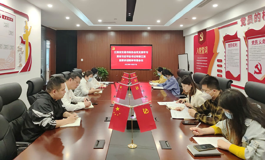 10月27日,江西省交易市場協會黨支部召開學習貫徹習近平總書記考察江西重要講話精神專題會議,會議由支部書記黃莉主持,協會執行會長、省聯交運公司董事、總經理劉祖國同志出席會議,支部全體黨員(含預備黨員)、發展對象、入黨積極分子一同參會。