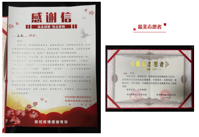 近日,江西省聯交運登記結算中心員工、江西省交易市場協會黨員干部應杰同志收到了中共西湖區桃花鎮委員會、桃花鎮人民政府的感謝信和南昌市桃花鎮橡府社區居委會送來的最美志愿者證書。對應杰同志在疫情防控的特殊時期,積極參與社區防疫工作的付出和貢獻表示感謝。