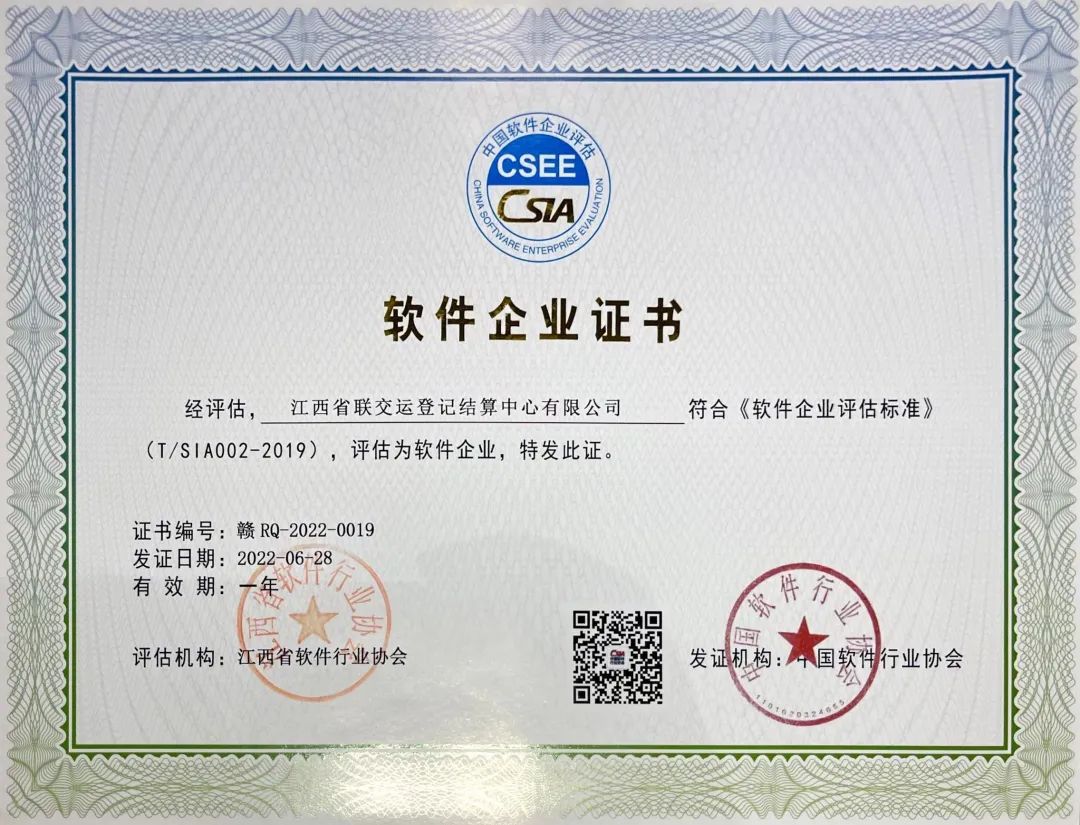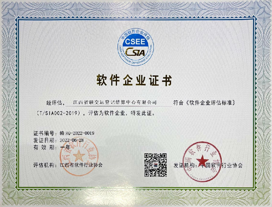 近日,江西省聯交運登記結算中心有限公司順利通過中國軟件行業協會資質審核,榮獲《軟件產品證書》和《軟件企業證書》,成為中國軟件行業協會“雙軟認證企業”。這是公司繼再次榮獲全國高新技術企業稱號和獲得多項軟件著作權權后又一重要企業榮譽資質,是公司堅持“監管科技+金融科技+登記結算”創新發展道路上獲得的又一殊榮。
