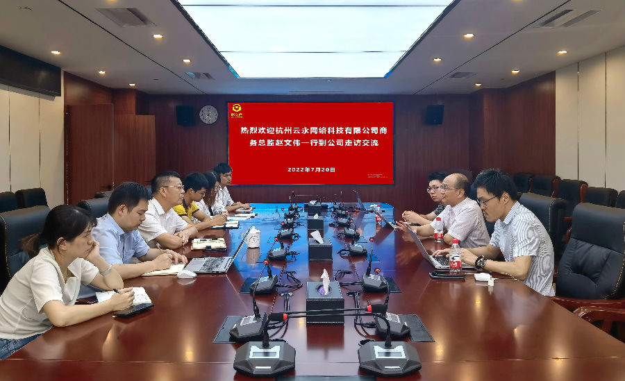 7月20日下午,杭州云永網絡科技有限公司商務總監趙文偉一行到公司走訪交流。公司總經理劉祖國、市場總監熊保明現場接待,業務管理部相關員工參加會議。