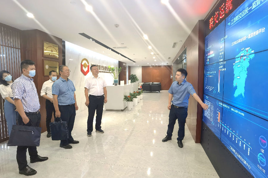 陳偉一行首先觀摩了公司輔助監管信息展示大屏,詳細了解公司“統一監管平臺”、“贛金鷹眼平臺”、“贛金衛士平臺”等輔助監管平臺建設案例成果并表示贊賞。