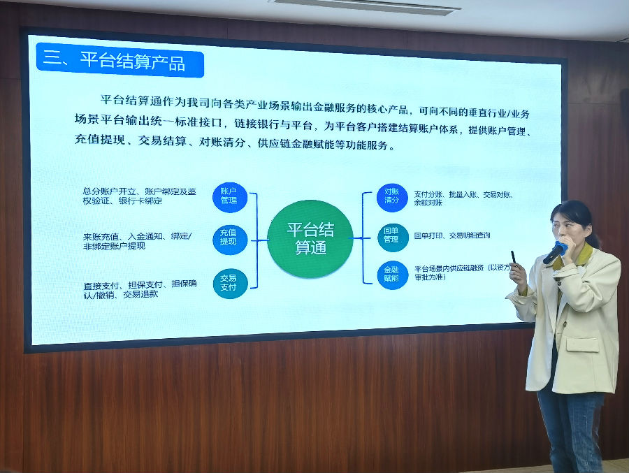 之后,市場總監熊保明對平臺結算通產品進行了詳細介紹。他介紹到,平臺結算通產品可為相關產業平臺和供應鏈核心企業/平臺提供基于第三方的統一賬戶管理和結算體系,滿足多類線上產業平臺的資金存管、實時結算、賬戶管理等共性需求。目前公司已對接上線和正在對接多家重點產業平臺,下一步將重點向我省“2+6+N”重點產業群推廣應用。最后,綜合管理部技術主管徐波從技術角度出發,對平臺結算通產品開發管理思路等進行了介紹,并表示將持續做好技術保障工作,為公司“結算+科技”發展貢獻更多技術力量。