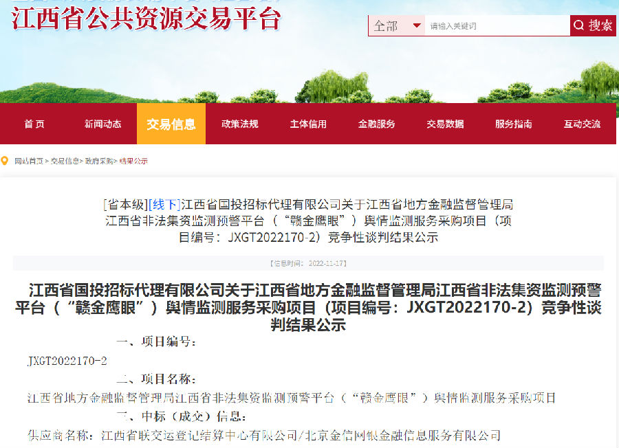 繼連續兩年中標江西省非法集資監測預警平臺(“贛金鷹眼”)運維服務項目后,近日,江西聯交運又中標江西省非法集資監測預警平臺(“贛金鷹眼”)輿情監測服務項目。
