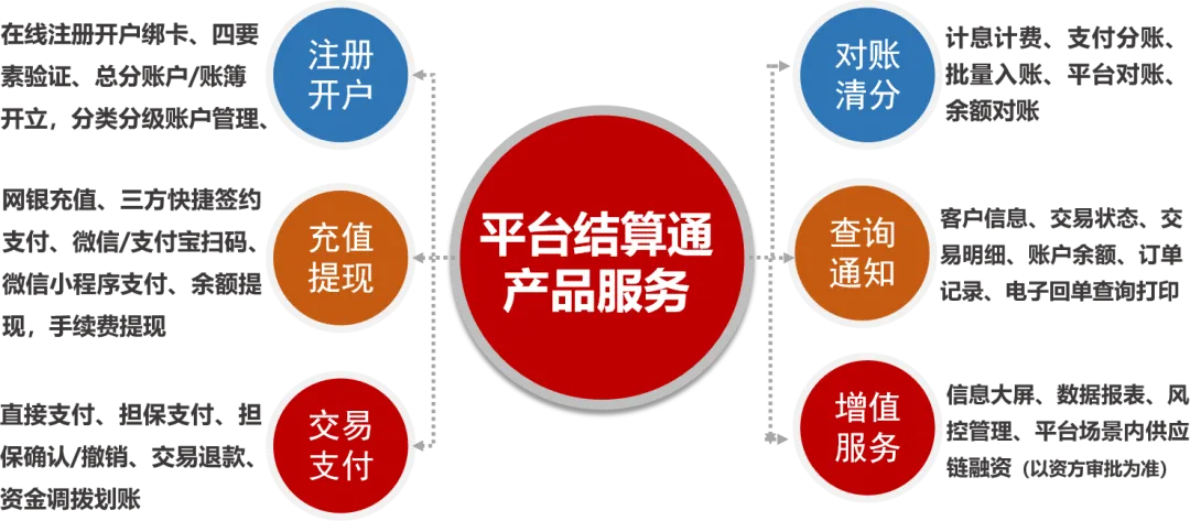 內部結算管理難 效率低、運營成本高 | 功能完善的總分賬戶體系 一站式線上對賬清分 支持擔保支付、保證金支付、直接支付、批量支付 |