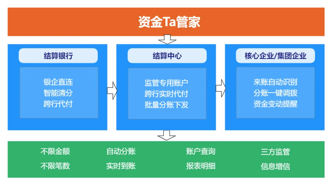 資金Ta管家產品介紹 資金Ta管家產品是公司基于省級登記結算中心職能和優勢,在結算銀行開設資金結算管理專戶,為各類具有集中批量資金結算管理需求的供應鏈核心企業、集團企業等提供監管專用賬戶、跨行實時代付、批量分賬下發等全流程資金結算管理服務。 資金Ta管家產品能有效幫助各類企業降低財務成本、提升結算效率。同時,公司作為具有公信力的省級登記結算中心,資金Ta管家產品在幫助企業進一步防范賬戶操作風險、規范資金結算管理,對真實數據信息進行增信、幫助挖掘企業信用信息價值等方面也將發揮重要作用。 請點擊下方了解詳情↓